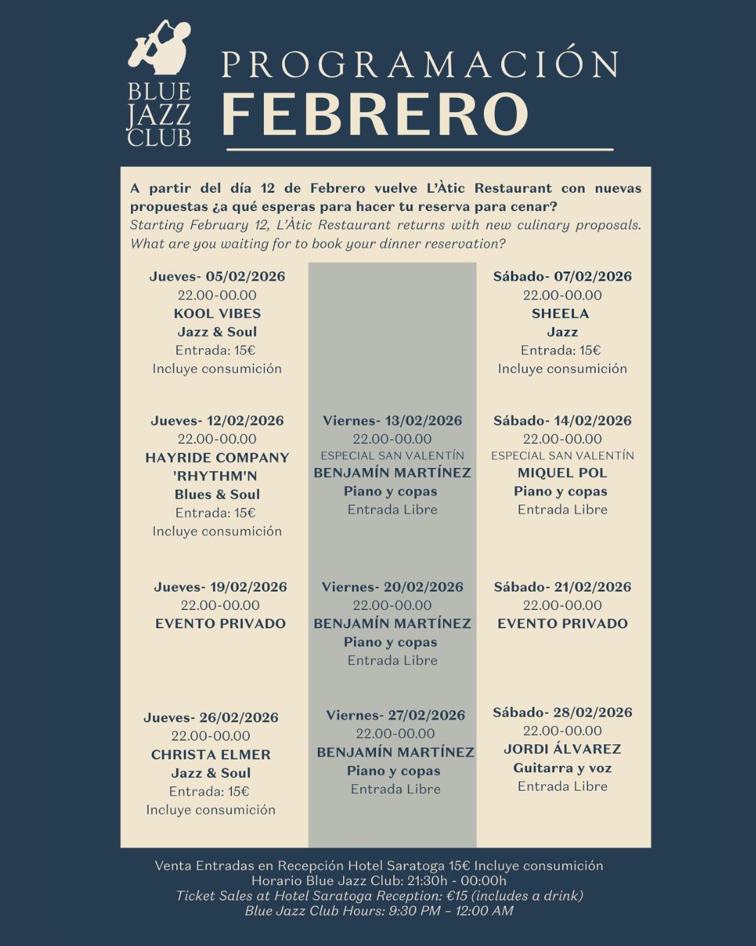 Mit einem sorgfältig ausgewählten Programm an Live-Konzerten, einer eleganten Atmosphäre und einem einzigartigen Blick über Palma wird der Blue Jazz Club erneut zum Treffpunkt für Liebhaber guter Musik, feiner Cocktails und echter Emotionen. Eine neue Ära beginnt – mit demselben Geist, der ihn einst zu einer Ikone machte: Leidenschaft für Jazz, Qualität und die Magie der Nächte im Saratoga.