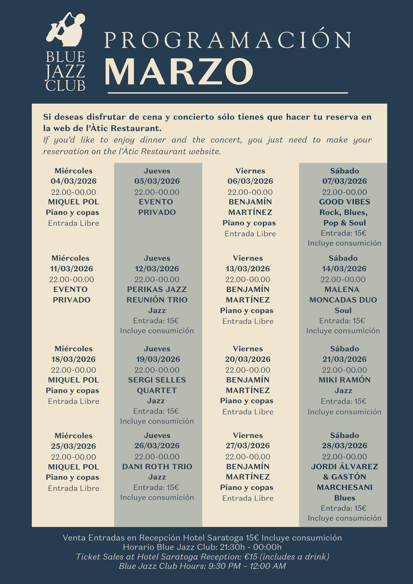 Im Jahr 1965 eröffnete das Hotel Saratoga im siebten Stock einen Veranstaltungssaal mit Live-Musik. Über viele Jahre war er ein Treffpunkt der mallorquinischen Gesellschaft, in dem Live-Musik und eine lebhafte Atmosphäre jeden Abend zu einem einzigartigen Erlebnis machten. Mit der Zeit wurde der Saal in ein Restaurant umgewandelt, wobei sein Charme und seine Tradition erhalten blieben. Erst im Jahr 2006 kehrte die Musik zurück und leitete eine neue Ära ein, in der Gastronomie und Live-Musik miteinander verschmolzen. So etablierte sich der Blue Jazz Club als Ort, an dem sich Kultur und Unterhaltung begegnen.